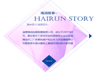 淄博海潤絲綢發(fā)展有限公司,成立于2007年8月。是在有五十多年歷史的原國有企業(yè)山東淄博絲織二廠(chǎng)政策性破產(chǎn)和山東飛天絲綢有限公司國有資本退出基礎上重組而成的股份制民營(yíng)公司,接收安置了原國有企業(yè)愿意繼續從事絲綢生產(chǎn)的所有員工。